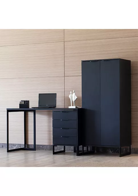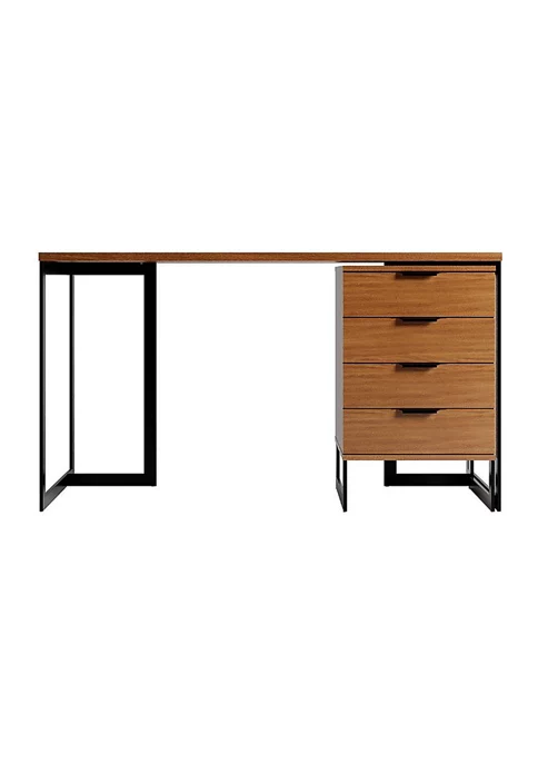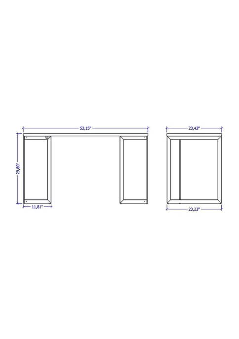 2-Piece Modern Desk for Home Office and Executive Office Use. * Upon Assembly, Measures: 53.15 in. Length, 29.8 in. Height, 23.43 in. Depth. 53.15 in. Length, 29.8 in. Height, 23.43 in. Depth. * Includes 4 Spacious Drawers With Simple .75 Gliding Mechanism. * Features Sophisticated Geometric Leg Base. * Option to Fit Drawers Beneath or Alongside Desk. * Features Include ABS Pull Handles * Legs Made of Carbon Steel with Black Finish for Fashion and Durability. * Home Assembly Required. All Hardware Included