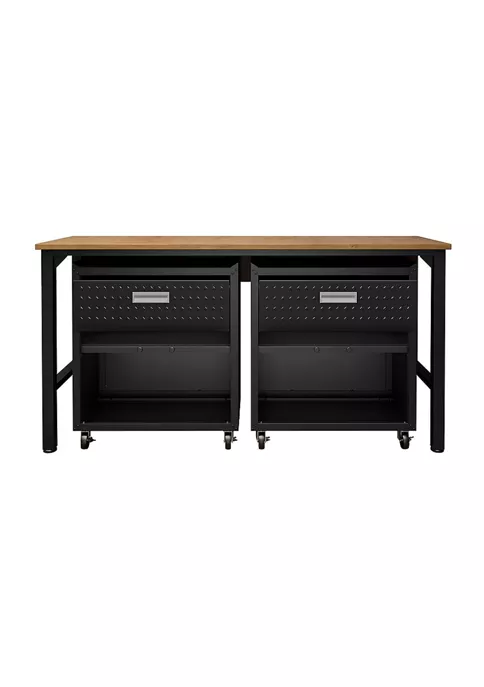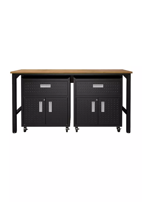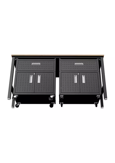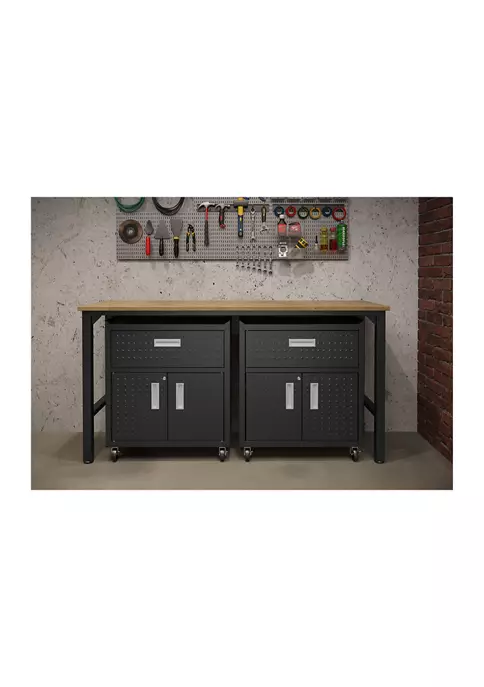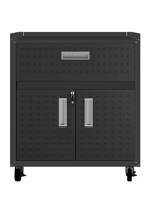 The Fortress Garage Collection gets its name for its durability, design, and craftsmanship. Included in the set is 3 highly functional units. The 2 Fortress Mobile Cabinets feature stainless steel swivel casters for easy mobility and a metal latch to lock wheels. Mobile cabinets also feature a space saving design as they fit perfectly under the Fortress Garage Table included in this set. Maximize your storage space with the Manhattan Comfort functional 3-Piece Fortress Garage Collection. Made with steel frames and textured doors. 3-Piece Fortress Mobile Space-Saving Steel Garage Cabinet and Worktable 4.0 in Charcoal Grey. Mobile Diamond Shape Texture Steel 31.5″ Storage Cabinet for Garage Use. * Upon Assembly, Cabinet Measures:30.3 in. Length, 31.5 in. Height, 18.2 in. Depth. Table Measures:72.4 in. Length, 37.6 in. Height, 20.5 in. Depth. * Includes 2 Mobile Garage Cabinets with 1 Full Extension Drawer, and 2 Doors with 1 Adjustable Shelf, and 1 Worktable. * Features Unique Door Lock and Key. * Stainless Steel Swivel Casters for Easy Mobility. Includes a Metal Latch to Lock Wheels. * Recessed Handle Features * Table Made of MDP Table Top with Melamine Finish and a Steel Frame and Base for Durability. * Home Assembly Required. All Hardware Included.