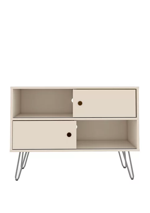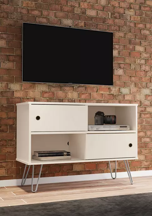 The Baxter TV stand moonlights as an end table and the perfect living or bedroom accent, while functioning as a storage and entertainment center in one subtle and sophisticated display. Four shelves hold your most impressive books or decorative accents to keep the room looking cool and clean, while two sliding doors conceal cable boxes, gaming consoles, and remotes. Circular openings perfect for wire management make it easy to set up and splayed metal legs play up the Mid-Century Modern design for added interest.