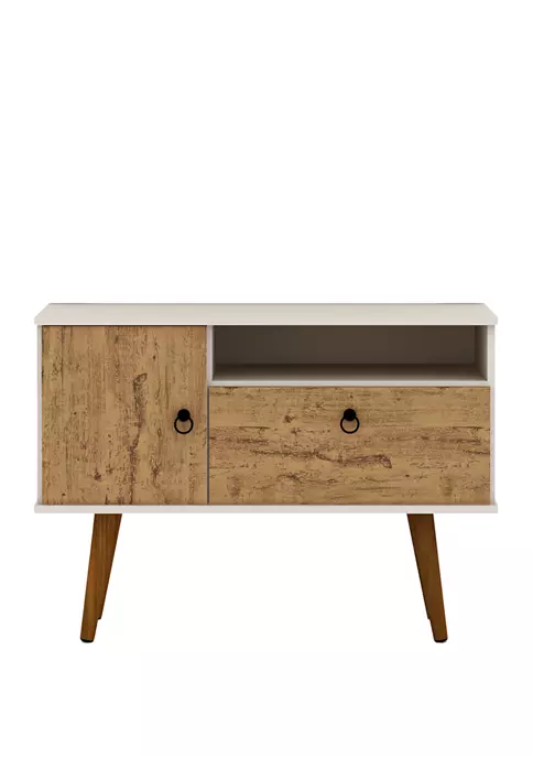 Part dresser, part living room entertainment focal point, the Tribeca TV stand is Mid-century modern at its best and is as versatile as it is functional. This piece couples as a dresser and easily showcases your television, tucking away any media accessories in the concealed shelving space, while an open shelf perfectly fits a DVD player or laptop. In the bedroom or in the living room, stow throw blankets, clothing, or table linens, this piece goes easily from space to space and blends with existing decor to create a statement. Splayed legs and clean lines make for a seamless look.