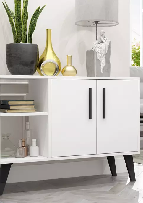 Become the entertainer you always wanted to be with this 35.43-inch white Amsterdam sideboard by Manhattan Comfort. With open shelving perfect for wine glasses, dishes, books, and favorite travel trinkets, and ample display space for platters and snacks, this sideboard is functional and will always remain a mainstay for your dining or living space. Two doors conceal a pair of shelves that work well for storing dinner party essentials and tucking away items when the event is over. Splayed legs and long handles keep this piece modern and sophisticated and blending easily with any existing decor.