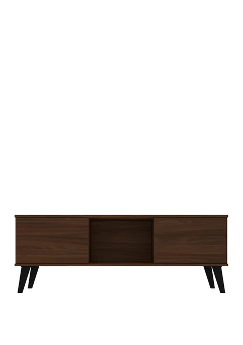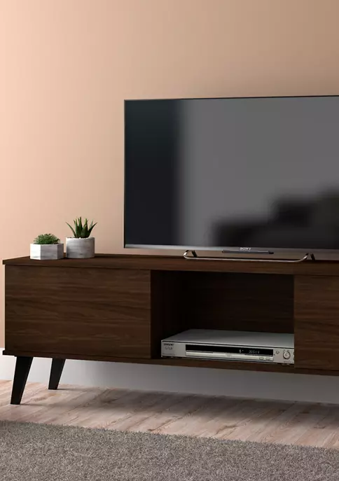Entertaining has never been easier or looked this good with the Doyers TV Stand, an edgy and modern piece thatβs simple in design, yet completely functional and seamless in any space. It has four concealed shelves perfect for tucking away all media accessories, electronics, books and beyond, and center open space to showcase a DVD player, coffee table books, and any favorite items to keep on display. Set decorative accents, framed family photos, or planters on its base to tie the space together, and invite friends and family over for a great movie night in.