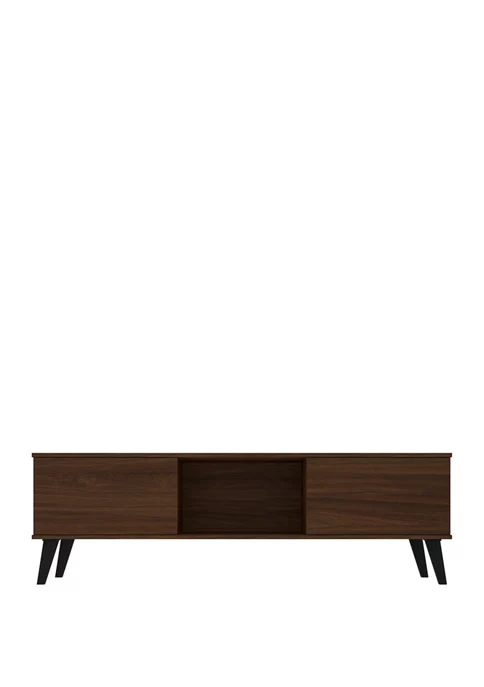 Entertaining has never been easier or looked this good with the Doyers TV Stand, an edgy and modern piece that’s simple in design, yet completely functional and seamless in any space. It has four concealed shelves perfect for tucking away all media accessories, electronics, books and beyond, and center open space to showcase a DVD player, coffee table books, and any favorite items to keep on display. Set decorative accents, framed family photos, or planters on its base to tie the space together, and invite friends and family over for a great movie night in.