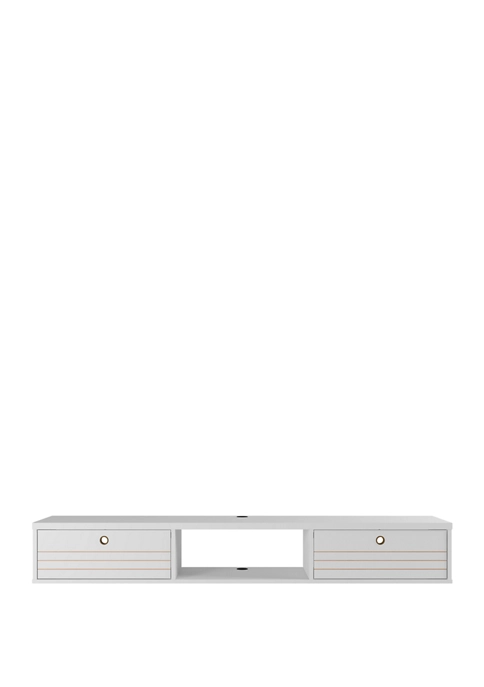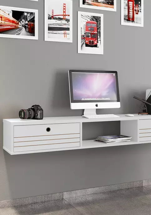 This 62.99-inch Floating Office Desk offers a modern, sleek style with its open shelving and minimalist closed compartments.