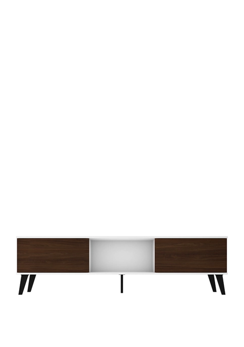 Entertaining has never been easier or looked this good with the Doyers TV Stand, an edgy and modern piece thatβs simple in design, yet completely functional and seamless in any space. With four concealed shelves perfect for tucking away all media accessories, electronics, books, and beyond, and center open space can showcase a DVD player, coffee table books, and any favorite items to keep on display. Set decorative accents, framed family photos, or planters on its base to tie the space together, and invite friends and family over for a great movie night in.