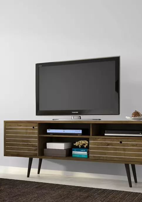 The Liberty 70.86-inch Mid-Century Modern TV Stand is mid-century modern at its best. Quality craftsmanship and careful detailing create the ultimate blend of style, functionality, and brilliant design. A sophisticated entertainment center, the piece features open shelving, as well as two hidden compartments perfect for stashing DVDs, board games, electronics, and media accessories. Free standing and easily moved, this stand will mix well with any decor and its artful grooves will create a statement in any space. Available in white, white and rustic brown, white and aqua blue, white and yellow, rustic brown, rustic brown and white, and rustic brown and yellow.