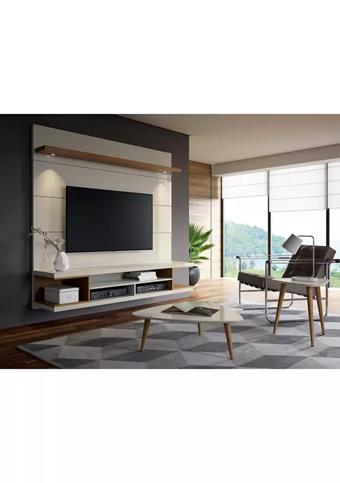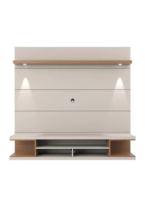 An entertainerβs dream backdrop in luxurious glossed off-white or white and maple cream, the Utopia Floating Theater Entertainment Center is modern, functional, sleek and sophisticated all at once. Equipped with convenient LED lights for a memorable movie night, open storage areas are perfect for tucking away DVD players, books, and all your media accessories, in one seamless theater room piece raising the standard and setting the bar high. Large enough to house a substantial television and built cleverly to hide away cable wires. Oak open shelves frame each end, while a middle section narrows to accommodate DVD players and catalogs.