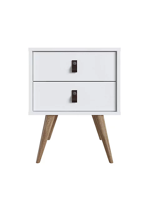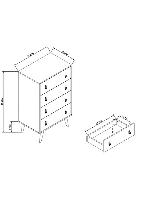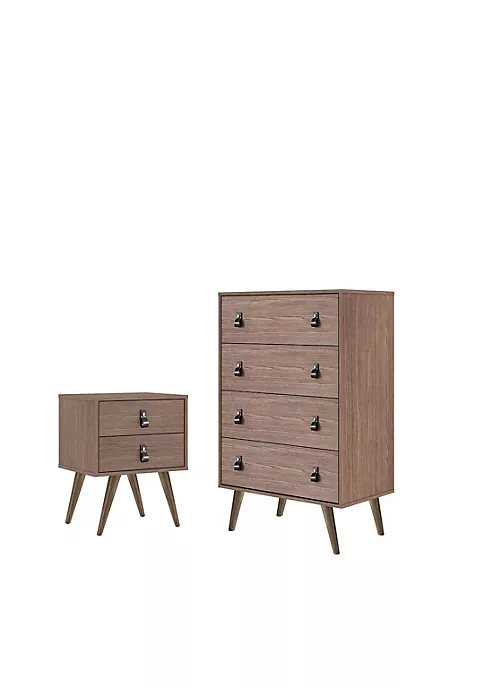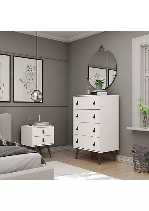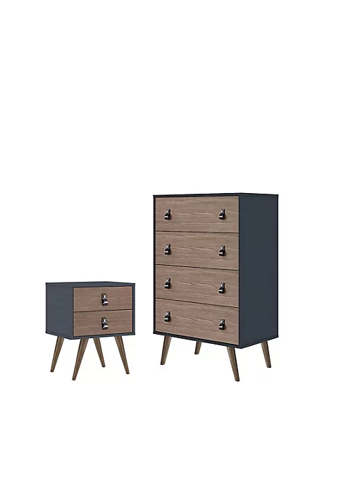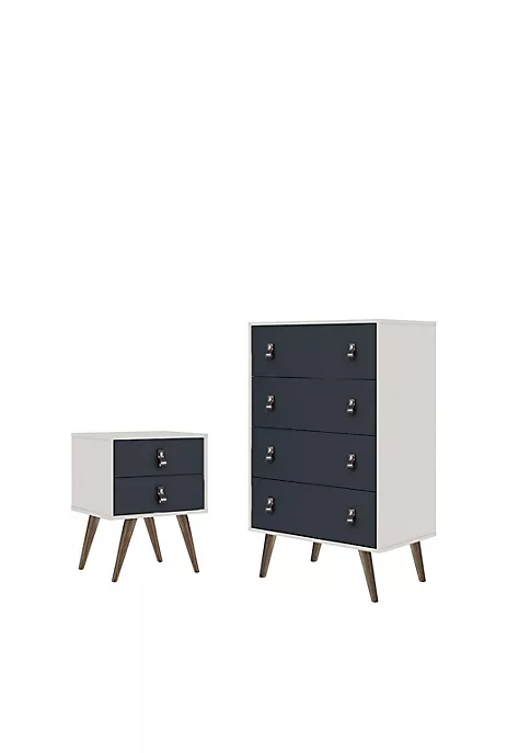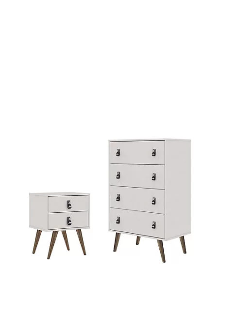Streamlined design and stunning, modern details come together in one clean and extraordinary piece. The Amber dresser and nightstand set brings mid-century modern design and a sleek and unique look, that updates any bedroom. Careful, quality craftmanship is seen throughout the piece, with a solid wood frame and clean lines. This set offers a combined total of 6 drawers with ample storage space. Faux leather button pull loops replace the standard handle, offering a fun and stylish twist to tradition. Offered in various stylish shades to compliment any styled home! Set includes 1 nightstand and 1 tall dresser. 2 Piece Mid-Century Modern Tall Dresser and Nightstand for Bedroom or Living Room use. * Tall Dresser Measures: 27.2 in. Length, 44.6 in. Height, 17.9 in. Depth. Nightstand Measures: 17.7 in. Length, 22.8 in. Height, 15.15 in. Depth. * Recommended for up to a 25″ TV Stand. * Includes Sleek Drawers for Storage Usage. * Frame Made of MDF and MDP Mix with Painted Finish. * Unique Faux Leather Pull Button Handles Adding Glam and Sophistication to your Room. * Fashionable Splayed Legs made from Solid Eucalyptus Wood for Extra Durability. * Home Assembly Required. All Hardware Included.
