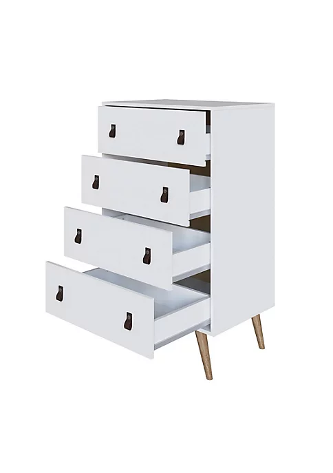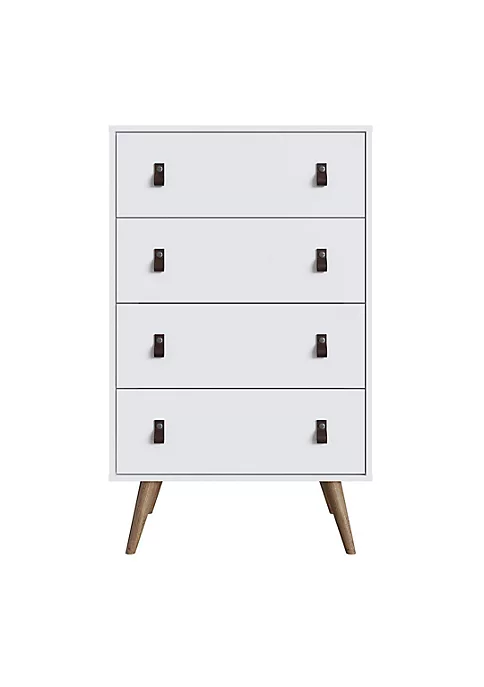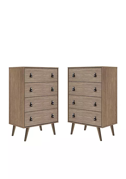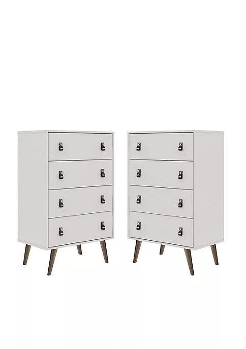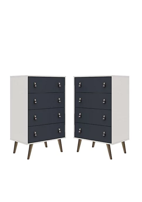 Streamlined design and stunning, modern details come together in one clean and extraordinary piece. The Amber tall dresser set brings mid-century modern design and a sleek and unique look, that updates any bedroom. Careful, quality craftmanship is seen throughout the piece, with a solid wood frame and clean lines. Four drawers offer ample storage space. Faux leather button pull loops replace the standard handle, offering a fun and stylish twist to tradition. Offered in various stylish shades to compliment any styled home! Set of 2. 2 Piece Mid-Century Modern Tall Dresser for Bedroom or Living Room use. * Upon Assembly, Measures: 27.2 in. Length, 44.6 in. Height, 17.9 in. Depth. * Recommended for up to a 25″ TV Stand. * Frame Made of MDF and MDP Mix with Painted Finish. * Includes 4 Sleek Drawers for Storage Usage. * Unique Faux Leather Pull Button Handles Adding Glam and Sophistication to your Room. * Fashionable Splayed Legs made from Solid Eucalyptus Wood for Extra Durability. * Home Assembly Required. All Hardware Included.