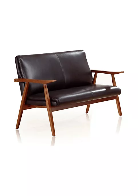 - Mid Century – Modern Loveseat Perfect for Living Room Use. | Measures: 51.2 in. Length | Frame Made of Solid Beech Wood with Amber Finish | Upholstered in Faux Leather with High Density Foam Filled Padding. | Elegant Center Vertical Stitching. | Comfortably Seats 2.