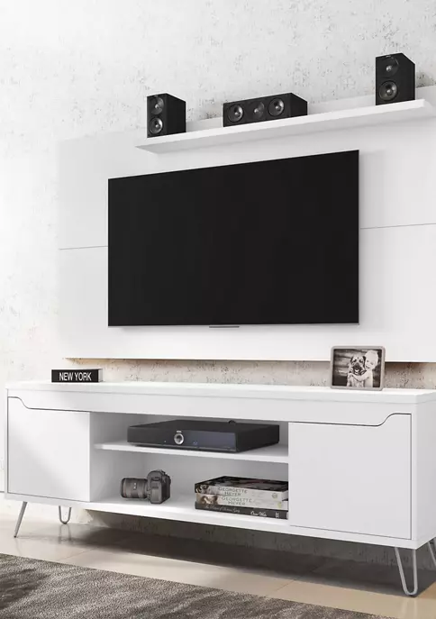 The 2-Piece Baxter and Liberty Combo is the perfect finish for Mid Century- Modern lovers! Two center rectangular shelves store all your media accessories and essentials, while two concealed storage compartments keep things like books, magazines, or DVDs safely stashed away. With its clean lines, splayed metal feet, and sleek design, this piece will impress all your guests and become your best purchase. TV Panel includes overhead shelf perfect for family photos, collectible, and décor items.