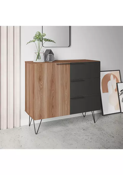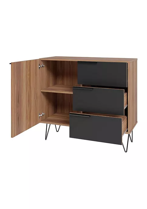Mid-Century Modern Buffet Stand and Sideboard for Dining and Living Room Use. * Upon Assembly, Measures: 35.43 in. Length, 31.88 in. Height, 13.77 in. Depth. * Recommended for up to a 32″ TV. * Includes 2 Shelves and 3 Drawers. * Unique Black Wood Vertical and Horizontal Handles. * Interior Shelf Dimensions: 11.49″ Height, 16.73″ Length. * Features Splayed Triangle Wire Metal Legs for Fashion and Durability. * Home Assembly Required. All Hardware Included