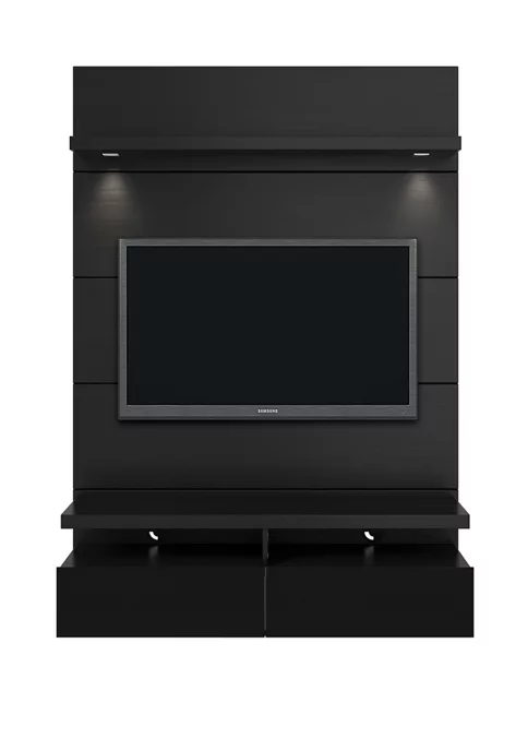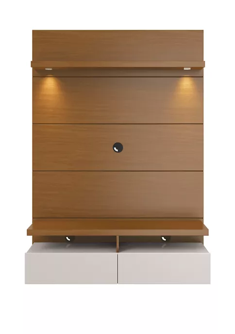 Featuring a classy design, this entertainment center by Manhattan Comfort has everything you need for a movie night or watch party, with built-in overhead lighting, shelf and drawer storage, and a sleek wooden panel to mount your TV on.