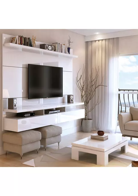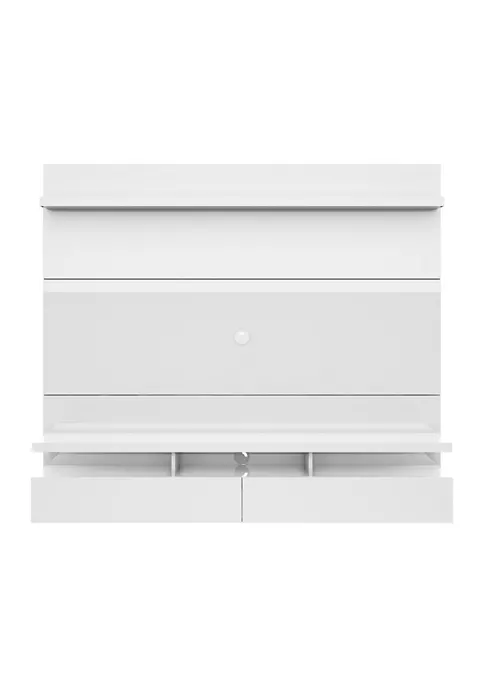 The City Theater Panel 1.8 designed by Manhattan Comfort creates a sophisticated theatrical vibe for your living room. Simply attach it to the panel using the built-in TV mount, lie back, relax and enjoy the view. The City 1.8 TV stand offers an organized space for your TV and accessories. The City 1.8 comes with built-in brackets to conveniently hang your TV and save floor space! Features 3 media shelves and 2 spacious cubbies with flip-down doors. Features an overhead shelf to display photos, collectibles, and trophies. Choose between different modern finishes to compliment your living environment. The unique finishes allow easy cleaning, so your TV stand always looks shiny and new. Recommended for concrete and brick walls, not drywalls. The unique paint is protected by the Microban Antibacterial Protection.