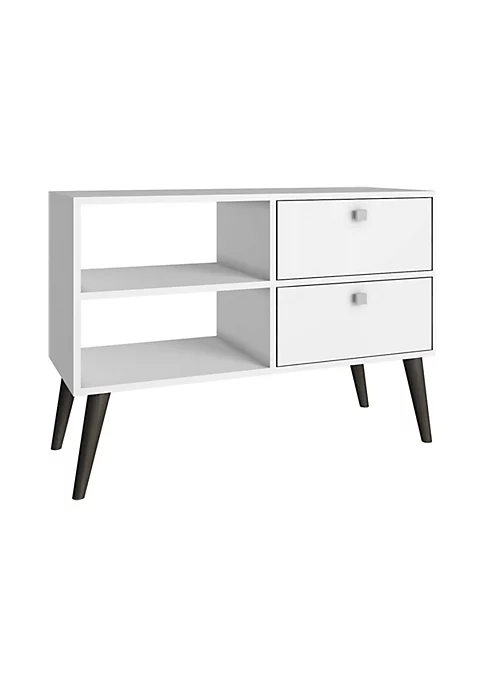 - Mid-Century – Modern End Table or TV Stand for Living Room Use. | Upon Assembly | Can be used as a TV Stand and Media Center | Splayed Legs Made of Solid Wood for Fashion and Durability. | Unique Square Knob Design | Includes 2 Drawers and 2 Shelves