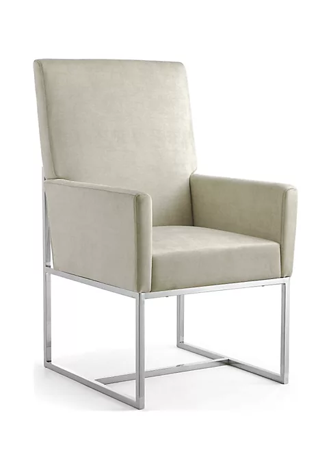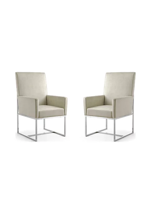 - Modern Dining Chair Perfect for Dining and Accent Living Room Use. Set of 2 | Measures: 23.74 in. Length | Open Industrial Design Stainless Steel Metal Frame Base with Chrome Finish | Upholstered in Luxurious Velvet with High Density Foam Filled Padding. | Tight Back Design | High Back Seat with Clean Simplistic Comfort Armrest.