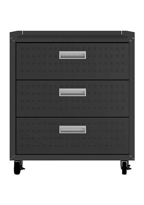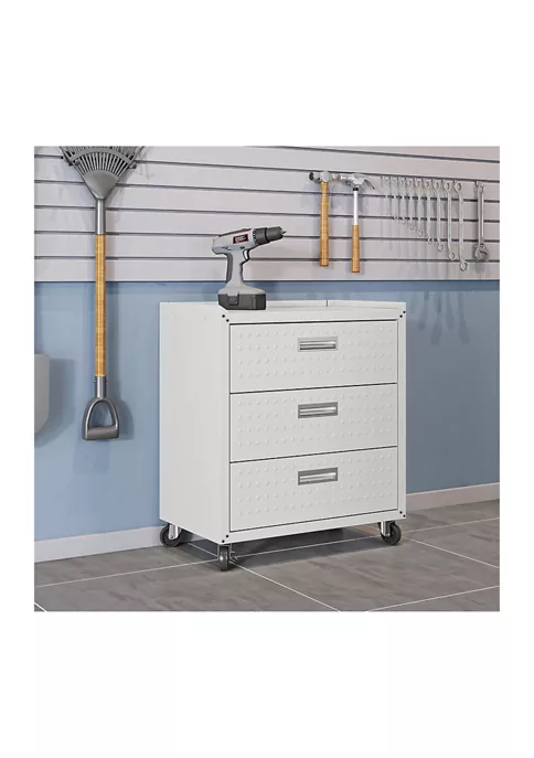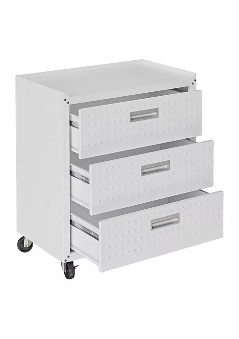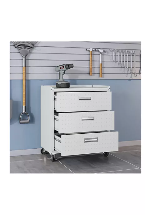 Fortress Textured Metal 31.5″ Garage Mobile Chest with 3 Full Extension Drawers in White. Mobile Diamond Shape Texture Steel 31.5″ Storage Cabinet for Garage Use. * Upon Assembly, Measures:30.3 in. Length, 32.1 in. Height, 18.2 in. Depth. * Includes 3 Full Extension Drawers. * Space Saving Design – Fits Under the Manhattan Comfort Fortress Garage Work Table. * Stainless Steel Swivel Casters for Easy Mobility. Includes a Metal Latch to Lock Wheels. * Recessed Steel Handle * Flat Surface Top to Work or Display Garage Items. * Home Assembly Required. All Hardware Included.