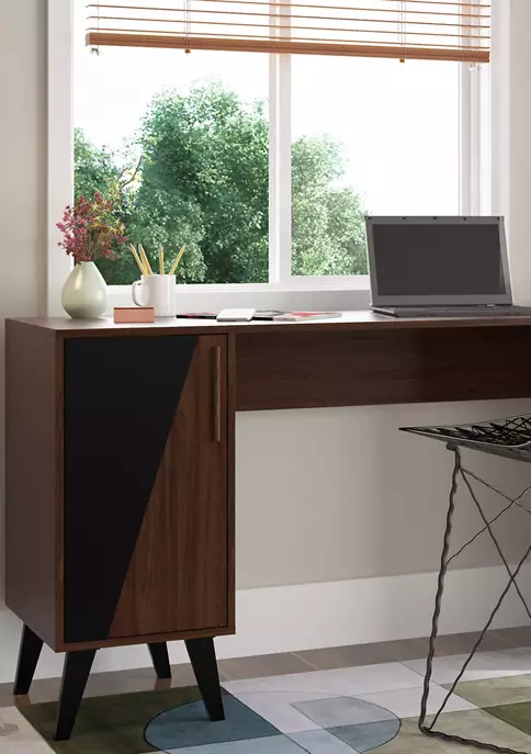 The most simple and yet the most artful, the Hogan desk is a Mid-Century elegantly designed piece, styled to perfection with its slanted side and seamless silhouette. Splayed legs on one side play up the design aesthetic and keep the desk current, while two concealed shelves and a slanted open door at a ninety-degree angle, offers functionality and ample storage space without compromising on design. Why simply work, when you can work in style? The Hogan desk has you covered.