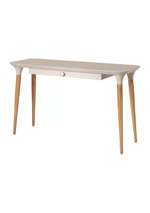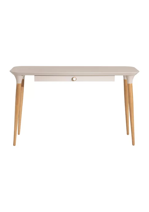 Consider this desk from Manhattan Comfort your most stylish spot for sparking creativity. Clean lines, natural pine, and rounded edges take this modern Scandinavian piece up a Notch. Perfect for creating a subtle workspace in a living area or tucked into a guest room to double as an unassuming end table, this piece functions however it suits the space and blends seamlessly with any existing decor. Smartly designed with all your tech needs in mind, a narrow drawer opens to reveal sectioned off areas fit for a laptop, tablets, pens, and other necessities, making it easy to tuck away electronics and personal items.