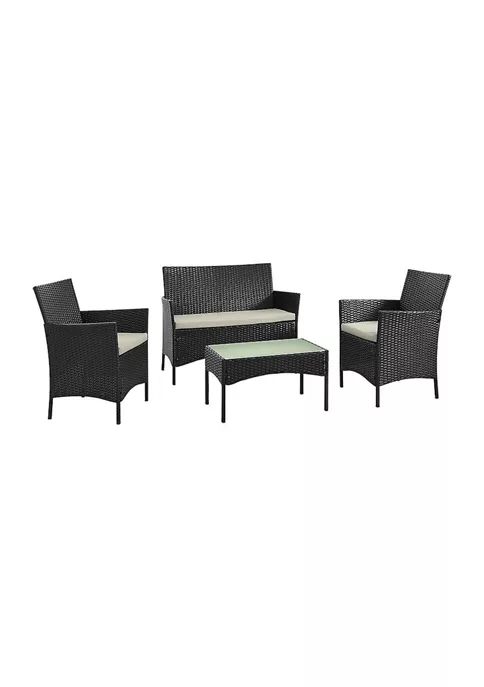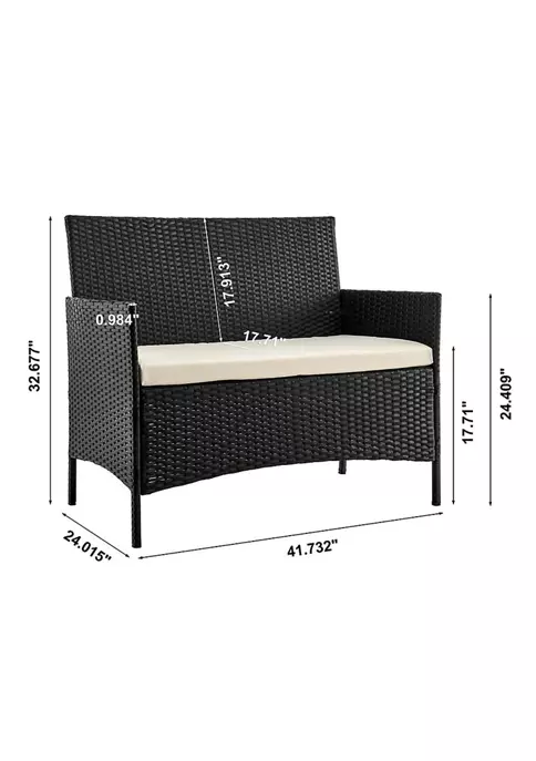 Modern 4-Piece Outdoor Conversation Patio Set with 2 Armchairs, 1 Loveseat, and 1 Coffee Table. * Loveseat Dimension Measures: 41.73″ Length, 24.02″ Depth, 32.68″ Height. * Chair Dimension Measures: 23.62″ Length, 24.02″ Depth, 32.68″ Height. * Coffee Table Measures: 31.50″ Length, 18.90″ Depth, 15.35″ Height. * Removeable Cushions with Zipper. Made of High Quality Water Proof Fabric. Washable Fabric. * Coffee Table Includes Removeable Tempered Frosted Glass * Frame Made of Steel Wrapped in PVC Rattan Perfect for Outdoor Weather. * Home Assembly Required. All Hardware Included