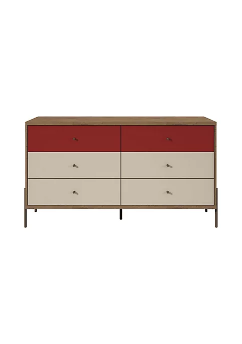 Quality craftsmanship and functional design meet to create the Joy Wide Double Dresser, equipped with six full extension drawers perfect for tucking away jeans, socks, and all your favorite tees. Mid Century modern flair and an industrial edge, keep this dresser modern and elegant, a beautiful addition to a bedroom or guest space.