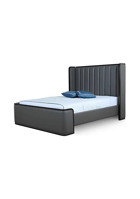 Clean geometric lines marry chic contemporary design to forge the bed frame. At first glance, the sleek panel upholstery and smooth edges catch your attention. The wrap around footboard leads to a semi open side panel, allowing access to linens, and ends with a panel stitched headboard that offers additional padding and comfort. Streamlined to perfection, the solid wood frame is beautifully upholstered with rich, supple leather, with even the smallest details receiving attention. The calculated simplicity of the bed is designed with a smart versatility, effortlessly complementing any decor style.