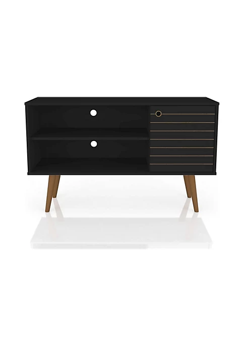 The Liberty 42.52 Mid Century Modern TV Stand is the perfect blend of quality craftsmanship, brilliant design, and purposeful functionality. Featuring 2 open shelves, and one hidden cubby to create the ultimate entertainment center perfect for stashing DVDs, board games, electronics, and media accessories. Free standing and easy to maneuver, this piece will mix well with any decor and its artful grooves will create a statement in any space.