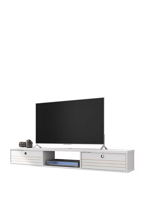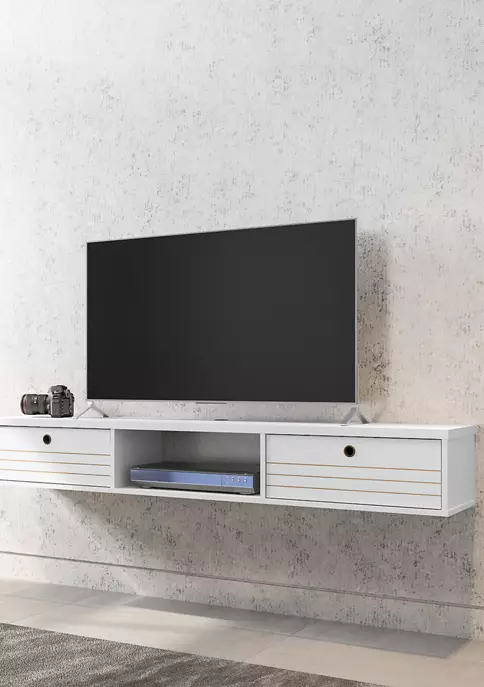 Seamless, functional, and a bit industrial chic, the Liberty floating entertainment center makes entertainment easy and stylish. Two concealed drop-down shelves and center open shelving are perfect for tucking away media accessories, books, DVD players, and more. This piece is both practical for a smaller or larger space, with clean lines, display space, and smart design.