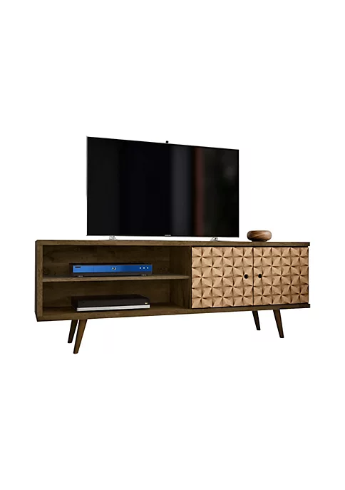 - Free Standing TV Stand for Living Room and Bedroom use. | Upon Assembly | Recommended for a 46″ -60″ TV. | Includes 1 Media Hole for Wire Management. | Fashionable Splayed Legs made from Solid Wood for Extra Durability. | Includes 2 Open Shelves and 1 Large Concealed Cubby Space.
