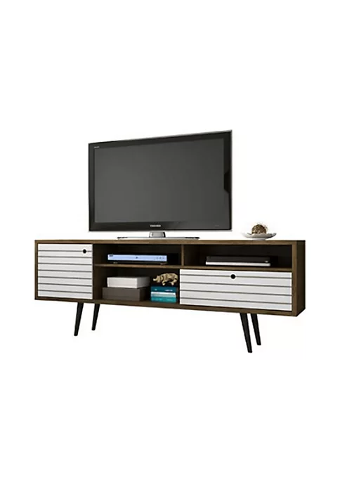 The Liberty 70.86 Mid Century Modern TV Stand is mid century modern at its best. Quality craftsmanship and careful detailing create the ultimate blend of style, functionality, and brilliant design. A sophisticated entertainment center, the piece features open shelving, as well as two hidden compartments perfect for stashing DVDs, board games, electronics, and media accessories. Free standing and easily moved, this stand will mix well with any decor and its artful grooves will create a statement in any space. Available in white, white and rustic brown, white and aqua blue, white and yellow, rustic brown, rustic brown and white, and rustic brown and yellow.