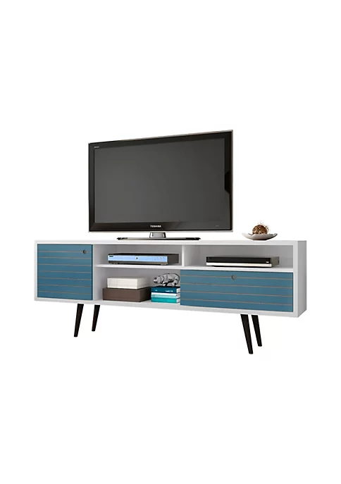 - Free Standing TV Stand for Living Room and Bedroom use. | Upon Assembly | Recommended for a 50″ -65″ TV. | Includes 2 Media Holes for Wire Management. | Fashionable Splayed Legs made from Solid Wood for Extra Durability. | Includes 3 Open Shelves