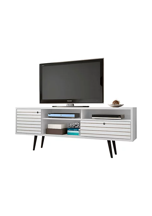 The Liberty 70.86 Mid Century Modern TV Stand is mid century modern at its best. Quality craftsmanship and careful detailing create the ultimate blend of style, functionality, and brilliant design. A sophisticated entertainment center, the piece features open shelving, as well as two hidden compartments perfect for stashing DVDs, board games, electronics, and media accessories. Free standing and easily moved, this stand will mix well with any decor and its artful grooves will create a statement in any space. Available in white, white and rustic brown, white and aqua blue, white and yellow, rustic brown, rustic brown and white, and rustic brown and yellow.
