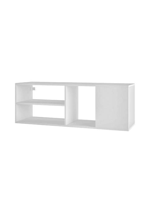 - Mid- Century Modern Floating TV Panel for Bedroom or Living Room use. | Upon Assembly | Recommended for a 48″ TV. | Includes 4 Open Shelves for Media and Storage Use. | Feature 1 Side Cubby Shelf with Measurements of: 14.96″ Height | Weight Capacity: 70 Lbs.