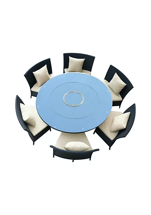 Food is always more fun outside. Intelligent design meets casual style in this fresh, inviting outdoor dining set. Boasting a clean and compact appeal, the six wedge shaped sectional chairs can be tucked in to form a seamless ring around the central table. Cozy accent pillows and brightly colored cushions add a festive pop of color. Perfect for sharing a meal with friends and family, the table top is finished with a chic glass lazy Susan in the center, making it easy to eat, drink, and laugh the night away.