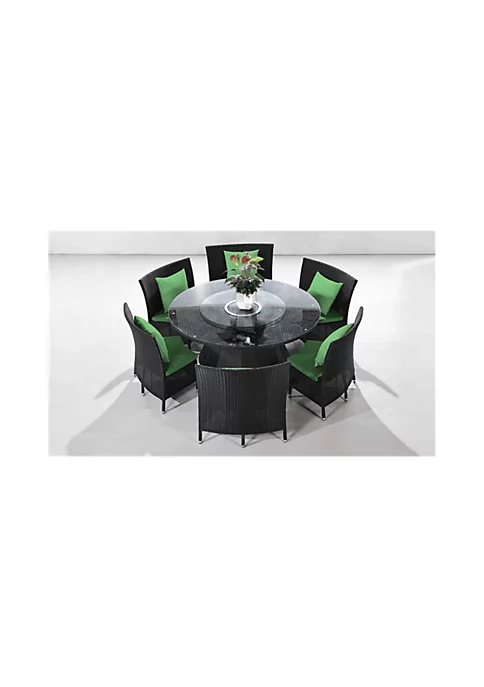 - 7 Piece Outdoor Patio Round Dining Set. | Table: 63 inches Diameter | Base Made of Rattan Wicker with Metal End Legs. Upholstered in Water Repellent All Weather Polyester Material. | Includes Round Glass Top. | Toss Pillows Included! | Tiered Glass Table Top Featuring a Rotating Lazy Suzan!