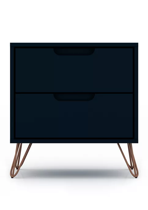 The Rockefeller Nightstand is the perfect bedside table, with two drawers that are ideal for tucking away personal items, tablets, books, and beyond. Versatile in design with mid-century clean lines and modern splayed metal legs, this piece blends well with any existing decor and can be used from space to space.