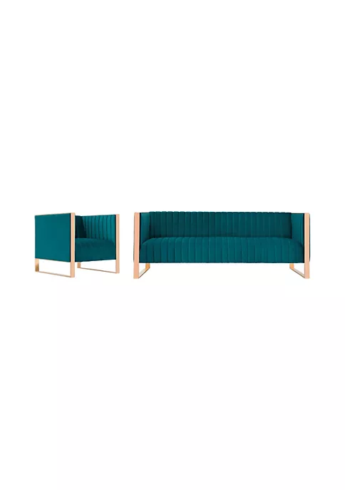 - Mid Century – Modern Sofa and Armchair Set Perfect for Living Room Use. Set of 2 | Armchair Measures: 32.68 in. Length | Stainless Steel Metal Frame with Rose Gold Finish. | Upholstered in Luxurious Velvet with High Density Foam Filled Padding | Crisp Tight-back Cushioning With Vertical Detailed Design Stitching. | Sophisticated Metal Base Mop Legs.