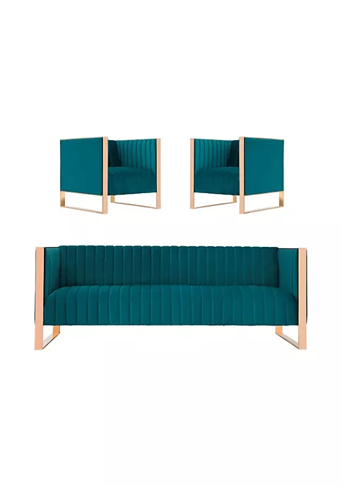 - Mid Century – Modern 1-Piece Sofa and 2-Piece Armchair Set Perfect for Living Room Use. Set of 3 | Armchair Measures: 32.68 in. Length | Stainless Steel Metal Frame with Rose Gold Finish. | Upholstered in Luxurious Velvet with High Density Foam Filled Padding | Crisp Tight-back Cushioning With Vertical Detailed Design Stitching. | Sophisticated Metal Base Mop Legs.