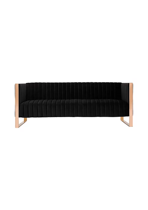 - Mid Century – Modern 3-Seat Sofa Perfect for Living Room Use. | Measures: 83.07 in. Length | Stainless Steel Metal Frame with Rose Gold Finish. | Upholstered in Luxurious Velvet with High Density Foam Filled Padding | Crisp Tight-back Cushioning With Vertical Detailed Design Stitching. | Sophisticated Metal Base Mop Legs.