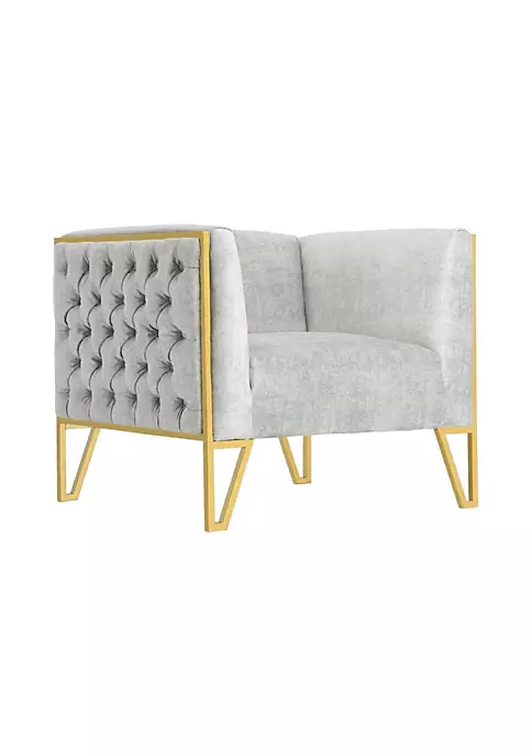 Dynamic. Contemporary. Upscale. Freshen up your living space with the Vector Accent Chair. Featuring a subtly geometric frame and open cutout feet, the design combines clean architectural lines with posh texture for an eye-catching look. Rows of deep button tufts accentuate either side of the chair, emphasizing the plush cushioning beneath its tailored velvet upholstery. It’s luxe polished brass finish perfects the look. Coordinate with the matching Vector Sofa for a stylish update to your decor.