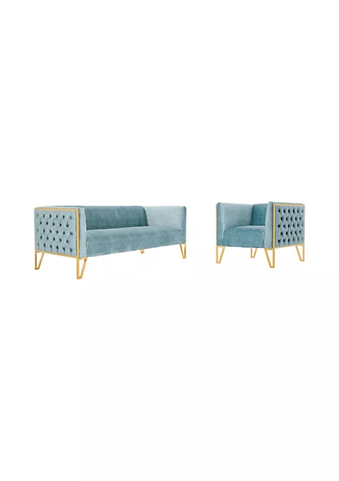 - Mid Century – Modern Sofa and Armchair Set Perfect for Living Room Use. Set of 2 | Armchair Measures: 35.83 in. Length | Stainless Steel Metal Frame with Polished Brass Finish. | Upholstered in Luxurious Velvet with High Density Foam Filled Padding | Tufted Button Accent Design for Plush Details | Geometric Triangle Hollow 4-Leg Base.