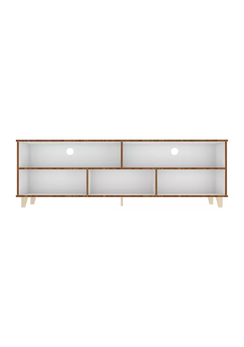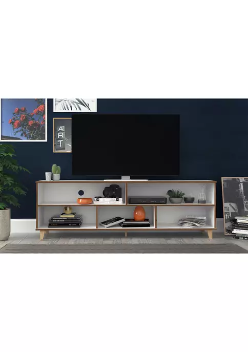 Part media center, part sideboard, part living, or dining room mainstay, the Warren TV stand from Manhattan Comfort is as purposeful as it is beautifully crafted. Supported by splayed oak legs and made from natural pine wood with oak detailing along with the open shelving, this piece instantly draws the eye in. Open airy shelving is perfect for showcasing books, dishes, media consoles, storage baskets, and a smooth top allows for displaying TV, plants, framed photos, and a bowl of popcorn for a cozy movie night in.